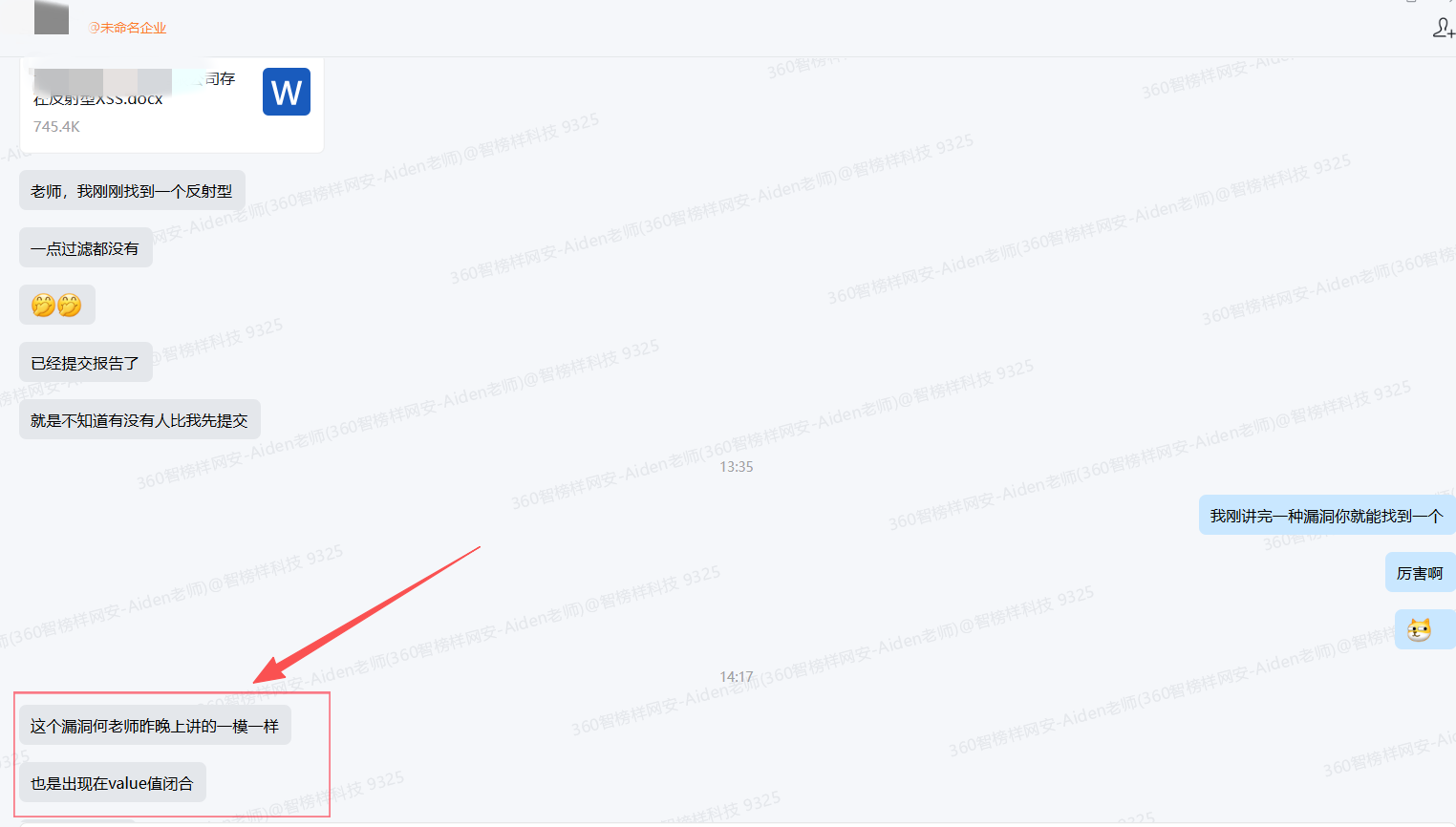 更让人惊喜的是,他的学习效率远超预期:老师前一晚刚在课堂上讲解了反射型 XSS 漏洞的挖掘逻辑,重点强调了 value 值闭合的关键细节,他第二天就在真实业务中找到了一模一样的漏洞场景,甚至连漏洞触发点都和课堂案例高度吻合。这种“学完就用、用就见效” 的实战反馈,不仅让他快速建立了技术自信,更让他体会到了网安实战的乐趣 ——“每挖到一个洞心情特舒服”,这份成就感,正是支撑他不断突破的动力。